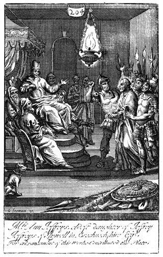 Description: Jesus is tried before the Sanhedrin at night. The names of the artist, G. Freman, and the engraver, Johannes Kip (1653-1722), have been set at the base, and as the numeral at the head of the page indicates, this is plate #204 in a series of illustrations.