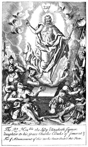 Description: Jesus raises from the dead. As the numeral at the head of the page indicates, this is plate #210 in a series of illustrations, and the name of the engraver, Peter Paul Bouche (b. ca. 1646), has been set at the base.