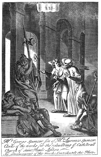 Description: An angel helps Peter escape from prison during the night. The name of the engraver’s name, Michael van der Gucht (1660-1725), has been set at the foot, and as the numeral at the head of the page indicates, this is plate #220 in a series of illustrations.