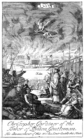 Description: Two angels drop a giant millstone, as Babylon (Rome) burns in the background. The name of the engraver, Johannes Kip (1653-1722), has been set at the base, and as the numeral at the head of the page indicates, this is plate #232 in a series of illustrations.