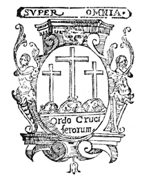 Description: This seal features the three crosses from the Crucifixion of Jesus. Situated above and below the crosses are two Latin inscriptions, "SUPER OMNIA," and "Ordo Cruciferorum," that read, "Above All," and "Order of the Crusaders," respectively.