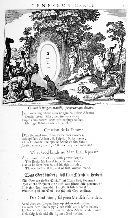 Description: God appears before Adam, Eve, and the animals. The figure of god is light surrounding a version of the tetragrammaton, the letters oriented with top to the right and bases to the left, reading up vertically.