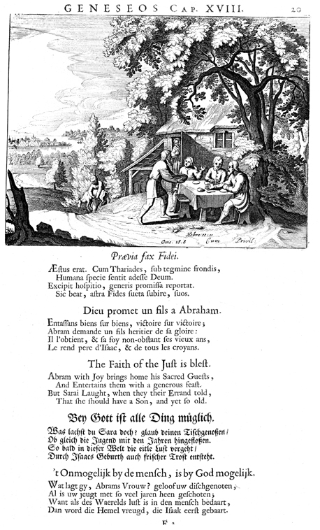 Description: Sarah stands in the doorway listening, as Abraham bows before the angels at Mamre and insists on preparing a meal for them. Note the citation of Hebrews 11:11.