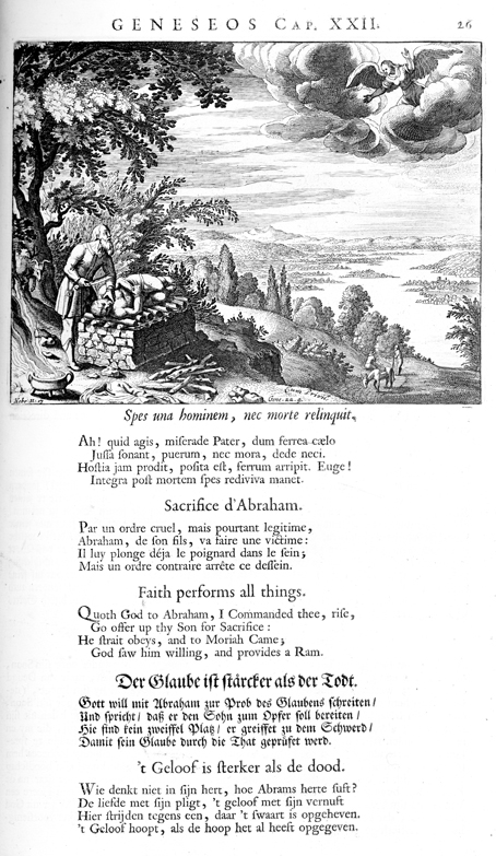 Description: Abraham is stopped by an angel from sacrificing his son. Note the citation of Galatians 4:23 at the base.