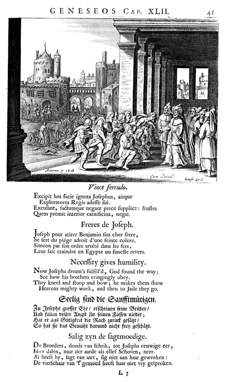 Description: Joseph conceals his identity from his brothers and accuses them of being spies, as they kneel before him and request grain during an intense famine. Note the citation of Acts at the lower left.