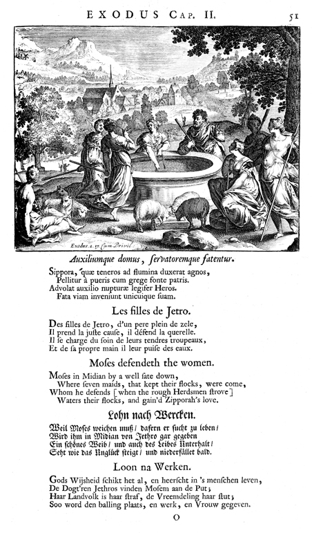 Description: Moses helps Reuel's daughters at the well of Midian.