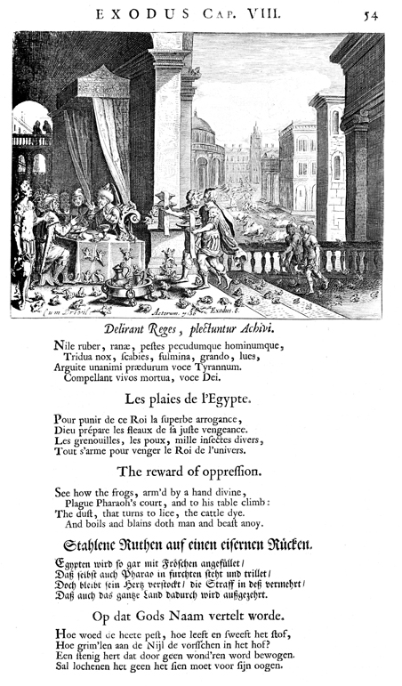 Description: Pharaoh is visited by the plague of frogs, as he tries to eat his dinner. In the background the animals are sick and dying from another plague.