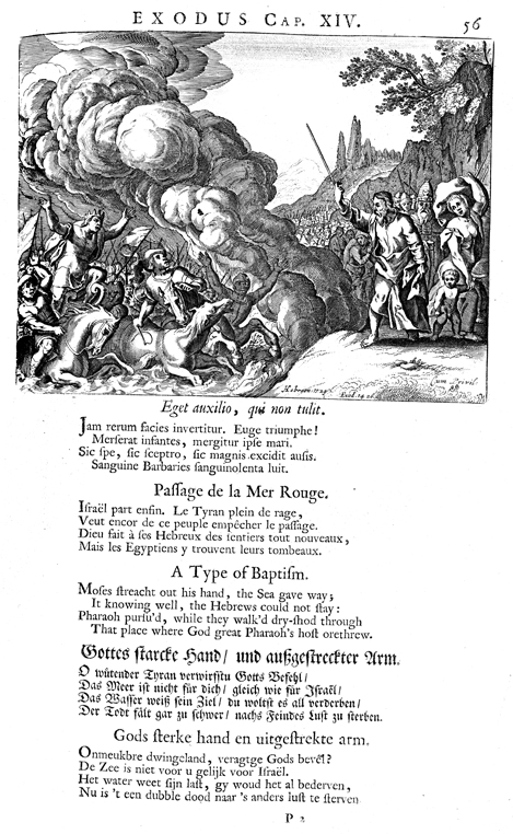 Description: Pharaoh and his men are drowned in the Red Sea or Sea of Reeds, while Moses and the Hebrews stand on the bank.