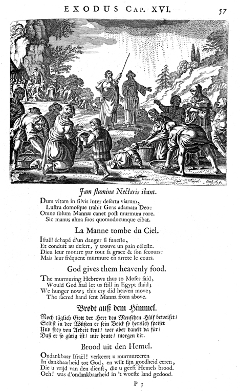 Description: Manna rains down from heaven for the Hebrews to eat.
