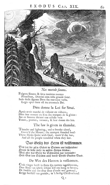 Description: Moses prays atop Mount Sinai, and God, represented by the Tetragrammaton, gives him the law.
