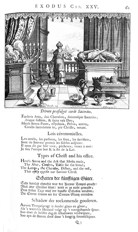 Description: Aaron stands in a chamber with the Ark of the Covenant, the table with the bread of the presence, lamp stand, and other ritual objects.
