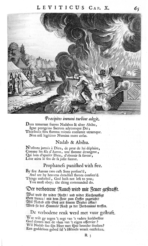 Description: Nadab and Abihu improperly offer a sacrifice to God by burning the sacrifice themselves. For their presumption they are burnt to death.