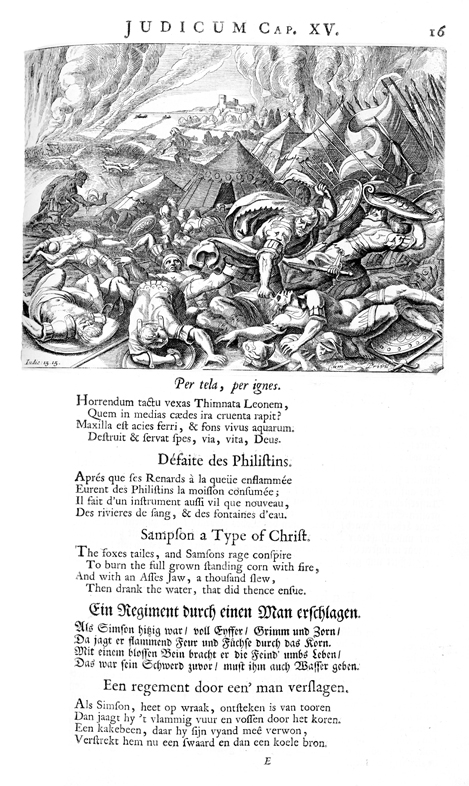 Description: Samson kills Philistines with the jawbone of an ass (foreground), while four foxes with their tails on fire burn the Philistine’s corn fields (background).