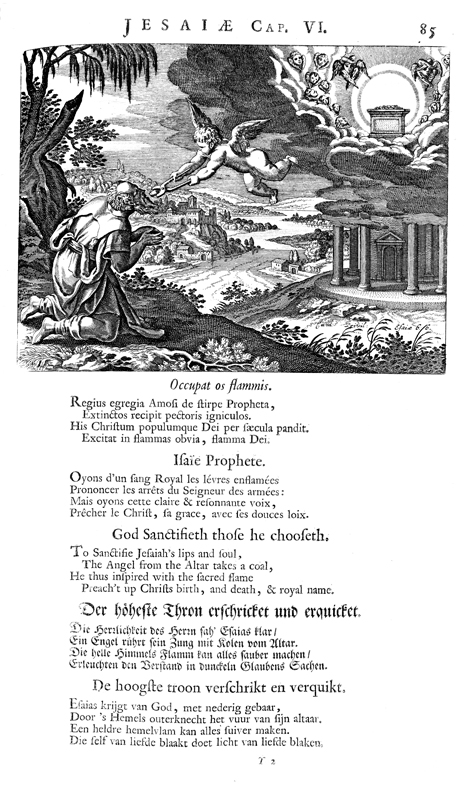 Description: Isaiah prays before his vision, and an angel touches a coal to his mouth to purify his speech.