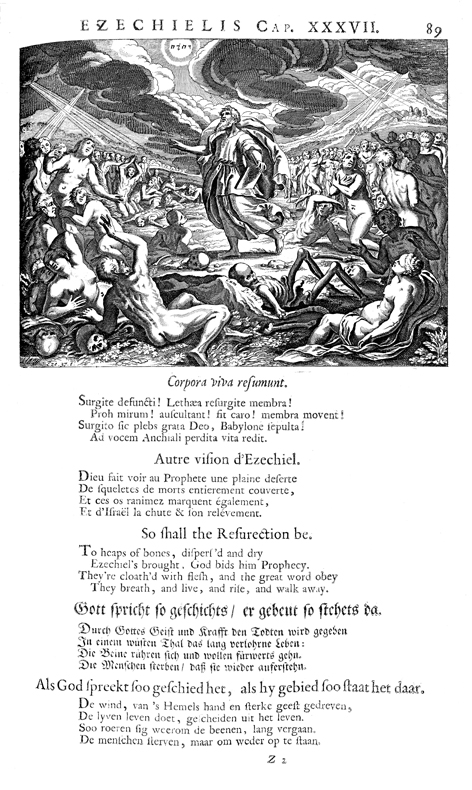 Description: Ezekiel preaches to a valley of skeletons and God’s message resurrects the dead. As is often the case in this volume, the Tetragrammaton represents God.