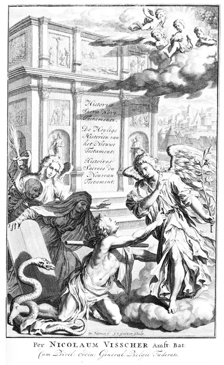 Description: An allegorical image that gathers the angel of the Annunciation (right) with Adam, the beguiling serpent, the tablets of the Law, Death, and the angel who expelled humans from the Garden of Eden. Designed by Philip Tideman (1657-1705) and engraved by Gillem van der Gouwen (1650-1720).