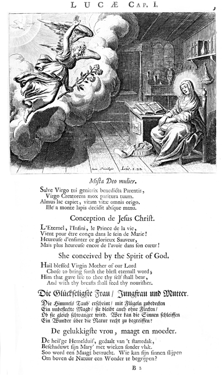 Description: Mary is visited by the angel Gabriel, with the Holy Spirit in the form of a dove behind him, to announce her pregnancy.