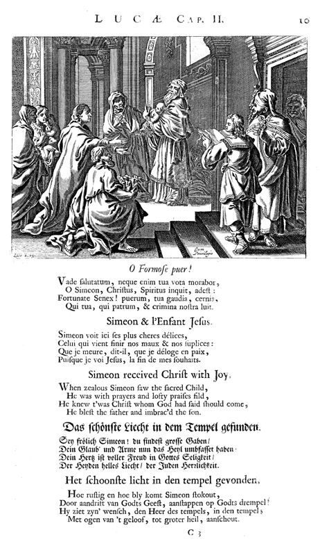 Description: Jesus is presented in the Jerusalem temple, as Joseph kneels with the sacrifice of two birds (Luke 2:22-24) and Mary stands behind him, arms outstretched. The righteous Simeon holds the infant Jesus (center; v.28), and the prophetess Anna stands beside him with her hands folded in a prayer of thanksgiving to God (vv. 36-38).