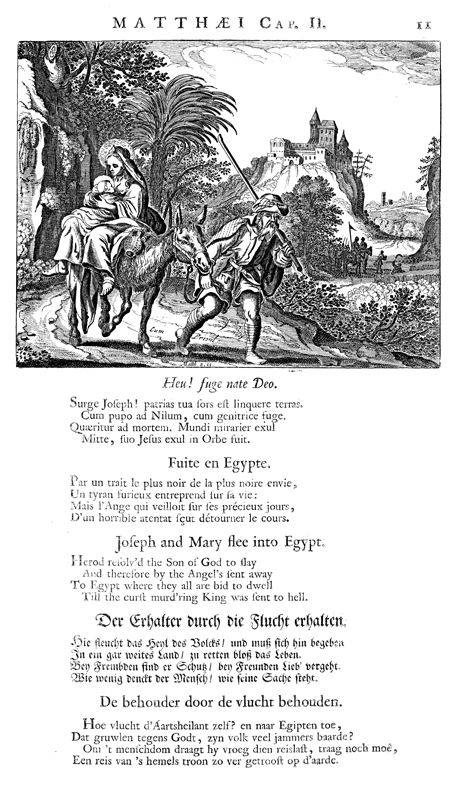 Description: Jesus and his family travel to Egypt to escape the wrath of Herod, who send his officers to find and slay the infant Jesus (background).
