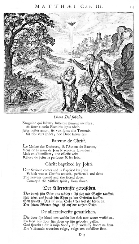 Description: Jesus is baptized by John the Baptist, and the Holy Spirit, in the form of a dove, comes down from heaven, along with God ‘s voice testifying that Jesus is his son.