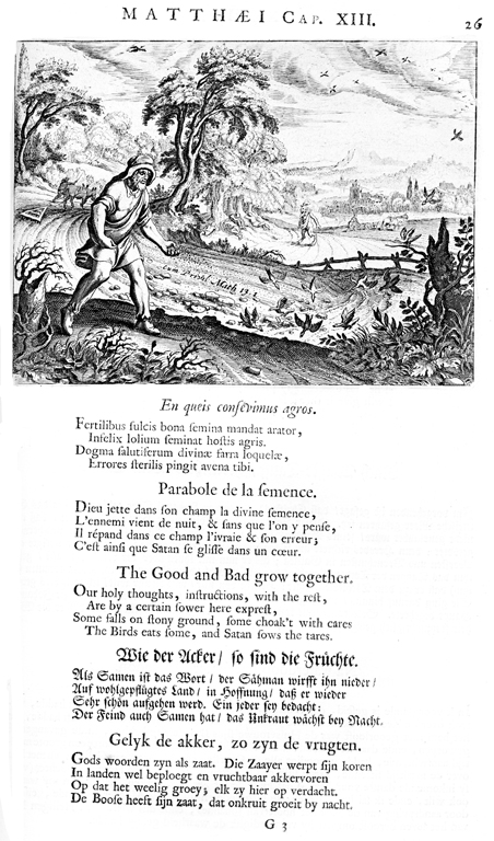 Description: A man casts seeds.Some fall into thorns, others on rocks, others are eaten by birds, and some grow.
