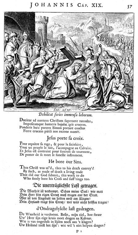Description: Jesus is carrying his cross with the assistance of Simon of Cyrene.