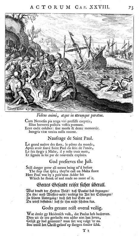 Description: Having shipwrecked on Malta (background), Paul sits by a fire and a snake leaps out to bite him.