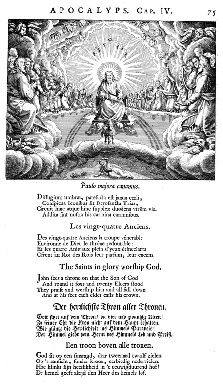Description: John sees Heaven’s throne room. Jesus sits on a throne with fire underneath it and a rainbow behind him. The sun provides his halo and above that are seven candles. At Jesus’ feet is a sacrificial lamb representing Christ. There are angels flying in the clouds above, and around the throne are 24 saints or elders who each removes their crown in humility before Jesus.
