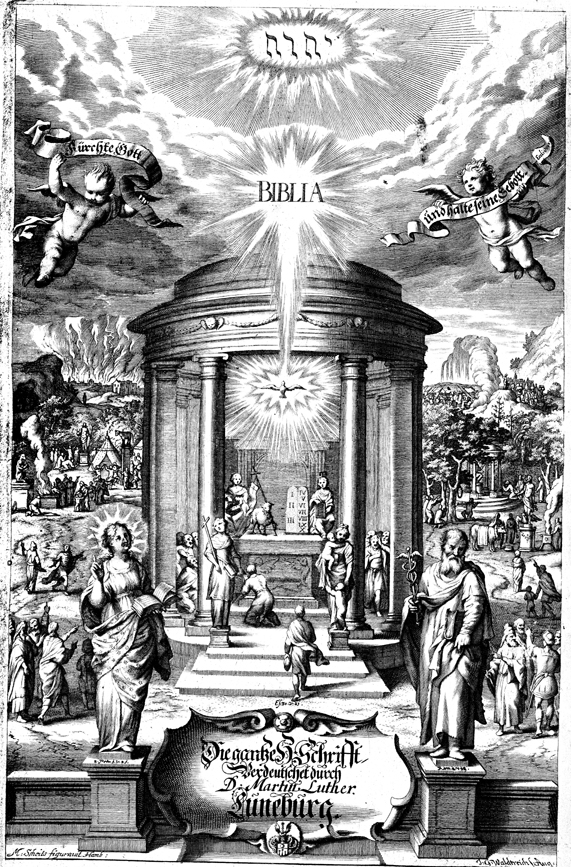 Description: Matthias Scheits' (c. 1630-1700) depiction of worshipers of God (center) and worshipers of idols (sides) beneath a depiction of God as the illuminated divine name (top).