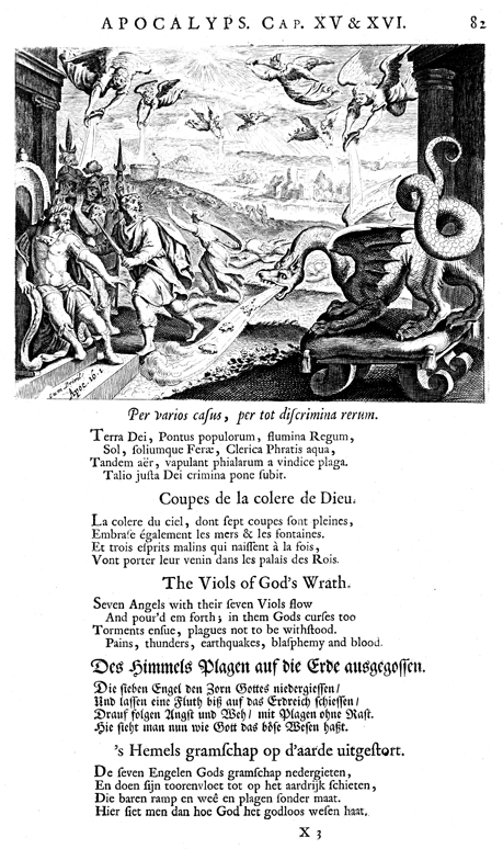 Description: Seven angels pour bowls of plagues onto the world, with one landing on the Beast who expels three frog-like spirits from his mouth in front of a frightened earthly king.