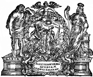 Description: The printer’s device of German publisher Johann Stern (1633 – 1712) features an image of God’s hand placing a laurel wreath on a man holding a fasces and a woman holding a palm branch. On either side of the image stand the representation of Labor in a man holding a shovel and the representation of Vigilance in an armored woman holding a spear. Below is the Latin phrase PAX ET CONCORDIA INVIDIAM PEDIBUS CALCANT which means “peace and harmony are envied and trampled".