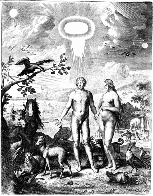 Description: Matthias Scheits' (c. 1630-1700) depiction of the created world; Adam and Eve stand in the Garden of Eden among plant and animal life, waters in background with heavenly bodies in the sky; God is depicted as light above. The name of the engraver, Melchior Kusell (1626 - c.a. 1683), is located at the bottom right.