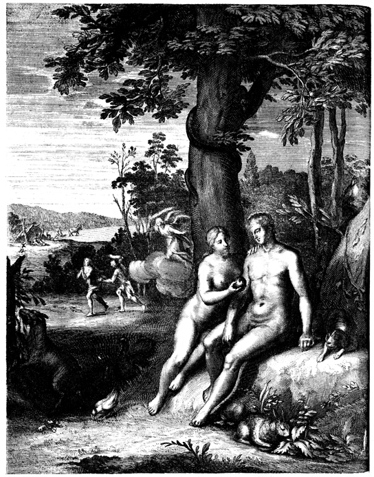 Description: Matthias Scheits' (c. 1630-1700) depiction of Adam and Eve partaking of the forbidden fruit (front), the expulsion from Eden (center), and Adam working the field while Eve tends to the children (back left).
