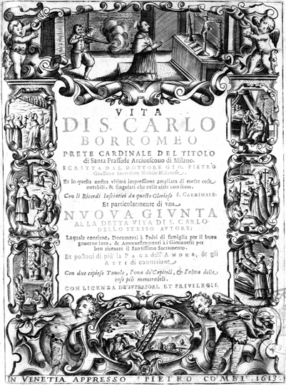 Description: Scenes from the life of Saint Carlo Borromeo: (from top right down) his birth, blessing the poor, blessing of the sick, seeing angels on a ladder between heaven and earth, as archbishop, feeding the hungry, and processing while holding a crucifix.