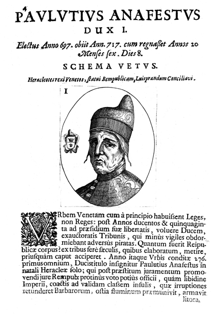 Description: A portrait of Venetian Doge Paolo Lucio Anafesto, traditionally regarded to have reigned from 697 to 717 though historians question whether he even existed. Tradition places Anafesto as a native of Heraclea, elected as Venice’s first supreme magistrate to unite its factions against the neighboring Equilio. His coat of arms, divided horizontally into two, contains a crown in the top half and a fleur-de-lis in the bottom.