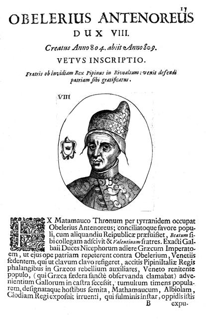 Description: A portrait of Venetian Doge Obelerio degli Antenori (d. c. 829), who reigned from 804 to 810. Aristocrats deposed and exiled Obelerio after he placed Venice under Frankish protection. Two decades later, he returned to Venice but was captured and executed for attempting to regain power. Obelerio’s coat of arms features a coronet.