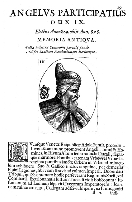 Description: A portrait of Venetian Doge Agnello Participazio (r. 810-827). Elected after repelling Frankish King Pepin’s invasion, he promptly moved the capital to Rialto, where all subsequent Doges would reside. His coat of arms features a lion rampant over a field of diagonal stripes.