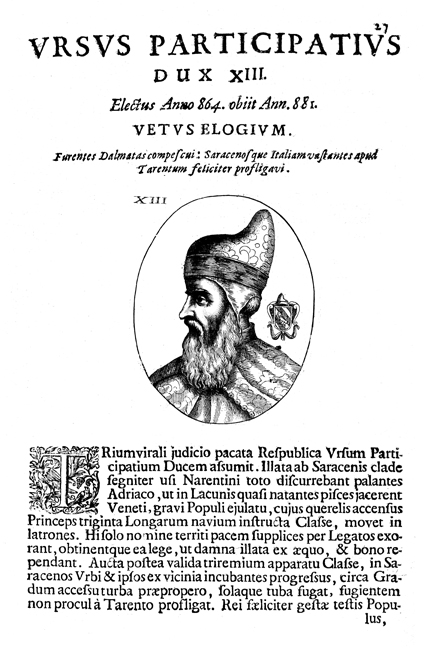 Description: A portrait of Venetian Doge Orso Participazio I (r. 864-881). The grandson of previous doge Agnello Participazio, Orso continued Venice’s wars against Saracen and Slavic pirates. Orso’s coat of arms features a lion rampant over a field of horizontal stripes.