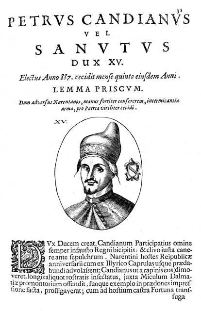 Description: A portrait of Venetian Doge Pietro Candiano I, who reigned for five months in 887. Young, affluent, and recommended by his predecessor, Candiano was expected to serve well Venice for years, but he died fighting the Slavonians, the first Doge ever to die in battle.