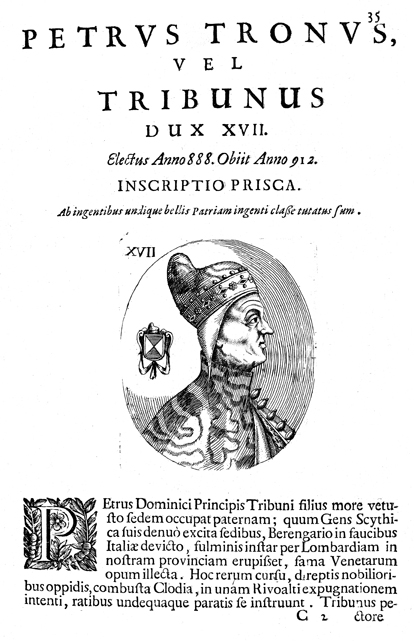 Description: A portrait of Venetian Doge Pietro Tribuno (r. 888-911). Tribuno concerned himself primarily with fortifying Venice’s defenses and led a successful defense against the Magyars. Tribuno’s coat of arms is a field divided into four by an X-shaped pattern.