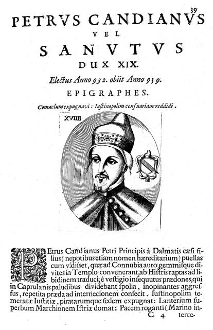 Description: A portrait of Venetian Doge Pietro Candiano II (r. 932-939). Pietro was a child when Narentine pirates killed his father Pietro I in battle. Under Pietro II, Venice defeated the Narentines, tightening its control over the Adriatic Sea.