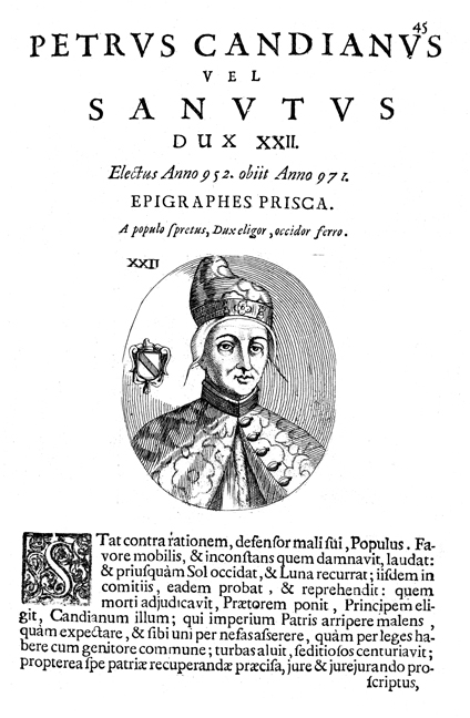Description: A portrait of Venetian Doge Pietro Candiano IV (r. 959-976), who succeeded his father Pietro III. Before becoming doge, Pietro IV usurped his father’s throne and was sent in exile, but his offenses were forgiven and he was recalled to Venice to succeed his father. Even as doge, however, Pietro IV steadily earned disfavor among the Venetians and died in an insurrection, along with his young son.