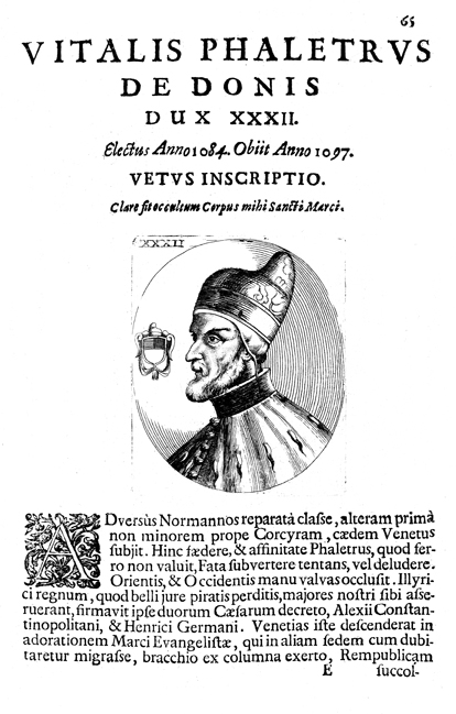 Description: A portrait of Venetian Doge Vitale Faliero (r. 1084-1095). Before becoming doge, Faliero formed part a ducal triumvirate headed by Domenico Contarini. Faliero’s coat of arms divides into quadrants, of which the upper two are colored.