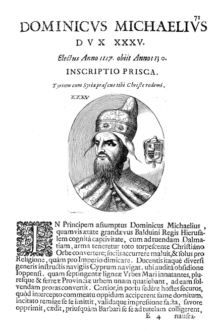 Description: A portrait of Venetian Doge Domenico Michiel (r. 1117-1129). He personally commanded Venice during its triumphant siege on Tyre. Michiel’s coat of arms is divided quarterly: the upper left contains a shooting star, the upper right contains a pattern of horizontal stripes, the lower left contains the same pattern beneath a right triangle of bezants, and the lower right contains two lions rampant and facing each other.