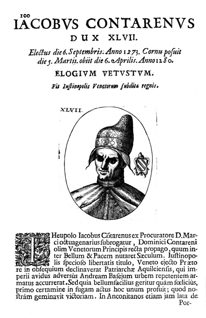 Description: A portrait of Jacopo Contarini, Doge of Venice (r. 1275-1280). Though the Contarini were a wealthy family, of Venice’s “apostolic” class, Jacopo himself was quite poor. Contarini’s coat of arms contains a pattern of left-to-right diagonal stripes.