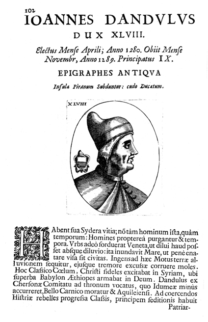 Description: A portrait of Venetian Doge Giovanni Dandolo (r. 1280-1289). Unlike his great-grandfather Enrico, Giovanni concerned himself with diplomacy more than war. His coat of arms is divided horizontally into halves.