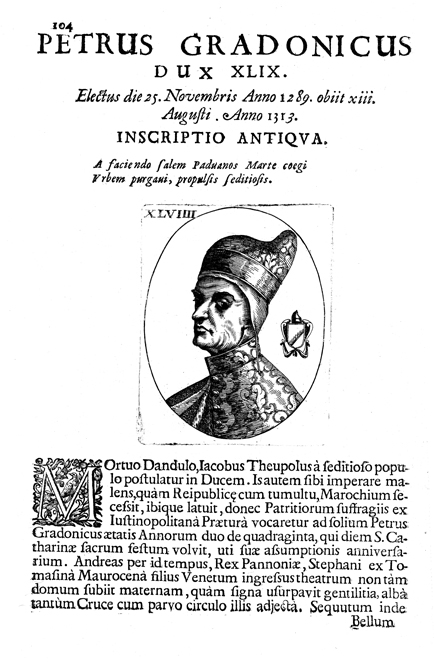Description: A portrait of Venetian Doge Pietro Gradenigo (1251-1311), who reigned from 1289 to 1311. As Doge, Gradenigo led a successful effort to render the Venetian government officially oligarchical. Despite two serious conspiracies to depose him and a papal interdict, Gradenigo reigned until his death. His coat of arms features a staircase.