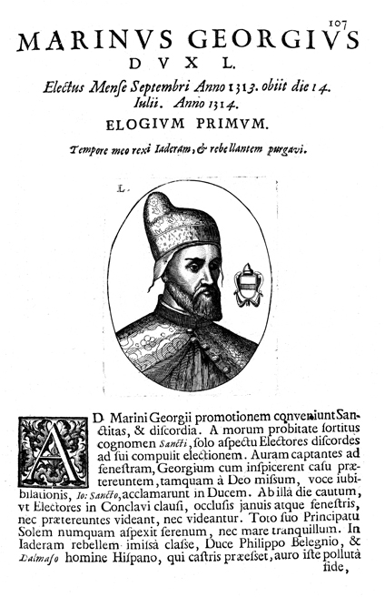 Description: A portrait of Venetian Doge Marin Zorzi, who reigned for ten months between 1311 and 1312. Zorziās accession is remarkable among those of other doges because Zorzi was unknown in political circles. Known as "Zorzi il Santo" (Zorzi the Holy), he was most famous for his philanthropy.