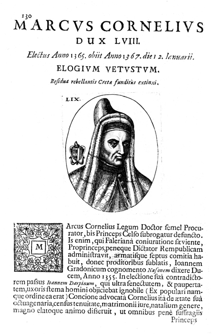 Description: A portrait of Venetian Doge Marco Cornaro (c. 1285-1368), who reigned from 1365 to 1368. A decade before his accession to the dogeship, Cornaro had helped to frustrate disgraced doge Marin Falier’s conspiracy against the Venetian aristocracy. Cornaro’s coat of arms is vertically quartered: the first two quarters are further divided horizontally, containing an assortment of crosses and three lions rampant.