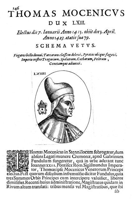 Description: A portrait of Venetian Doge Tommaso Mocenigo (1343-1423), who reigned from 1413 to 1423. Though Mocenigo led a successful war, he tended to favor Venice’s commercial empire over local territorial gain. Mocenigo’s coat of arms contains two five-petaled roses counterchanged across a horizontal field division.